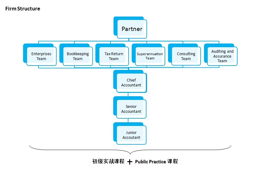 Public Practice领域的工作,这些一般都是accounting firm。一般分为两类。一类是big four以及second tier 的accounting的firm,他们是一般排名在澳洲Top 100 的accounting firm,工作内容主要包括Auditing and Assurance, Consulting, Deals, Enterprises, Private Clients and Tax.另外一类是有1-5个partner的中小型的accounting firm。主要内容是bookkeeping, tax return, SMSF,business set up等内容。Public Practice领域的工作与commercial and Industry有很大的不同,如果同学们对这个领域非常感兴趣也可以从Public Practice发展,但要进入big four 和second tier,竞争是非常激烈的,能够进入这些firm工作的international students更是凤毛麟角。我们的建议是可以先从中小型firm入手,然后再通过跳槽的方式进入比较大的firm工作。所以同学们在选择自己的 career path时需要考虑清楚。下面是比较典型的Firm的structure,希望大家有所了解: